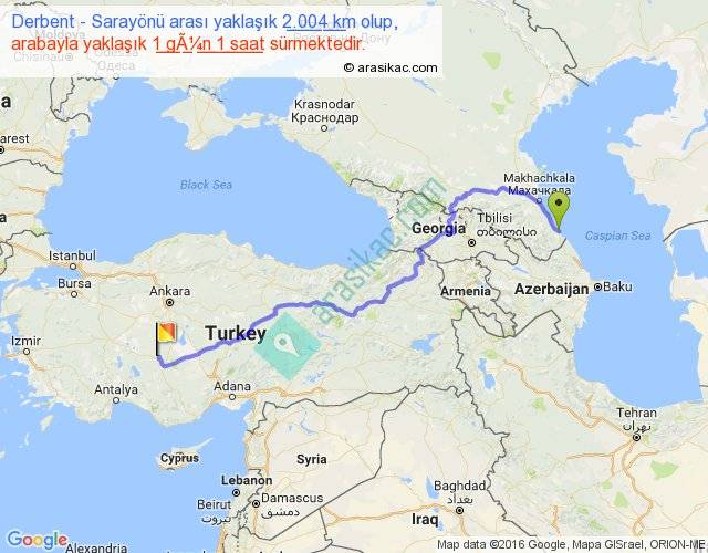 Derbent - Sarayönü arası yaklaşık olarak 90 km/h ile yukarıda belirtilen sürede olup, iki yerin kuş uçuşu uzaklığı (mesafesi) 1404'dir. Eğer belirtilen yerler arasında uçak seferi var ise bu süre uçakla 2 saat 09 dakika'ya kadar düşebilir. Yolculuk otobüsle 1 gün 8 saat sürmektedir.
