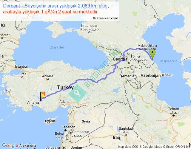 Derbent - Seydişehir arası yaklaşık olarak 90 km/h ile yukarıda belirtilen sürede olup, iki yerin kuş uçuşu uzaklığı (mesafesi) 1486'dir. Eğer belirtilen yerler arasında uçak seferi var ise bu süre uçakla 2 saat 17 dakika'ya kadar düşebilir. Yolculuk otobüsle 1 gün 9 saat sürmektedir.