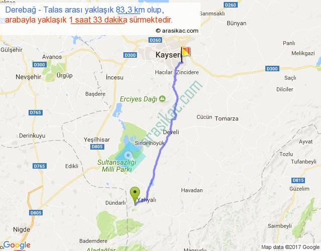 Derebağ - Talas arası yaklaşık olarak 90 km/h ile yukarıda belirtilen sürede olup, iki yerin kuş uçuşu uzaklığı (mesafesi) 71'dir. Yolculuk otobüsle 2 saat 0 dakika sürmektedir.