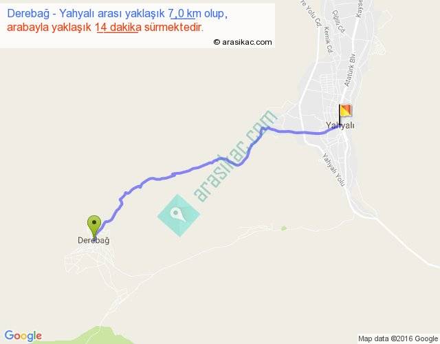 Derebağ - Yahyalı arası yaklaşık olarak 90 km/h ile yukarıda belirtilen sürede olup, iki yerin kuş uçuşu uzaklığı (mesafesi) 6'dir. Yolculuk otobüsle 18 dakika sürmektedir.
