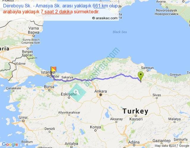 Dereboyu Sk. - Amasya Sk. arası yaklaşık olarak 90 km/h ile yukarıda belirtilen sürede olup, iki yerin kuş uçuşu uzaklığı (mesafesi) 555'dir. Eğer belirtilen yerler arasında uçak seferi var ise bu süre uçakla 51 dakika'ya kadar düşebilir. Yolculuk otobüsle 9 saat 8 dakika sürmektedir.