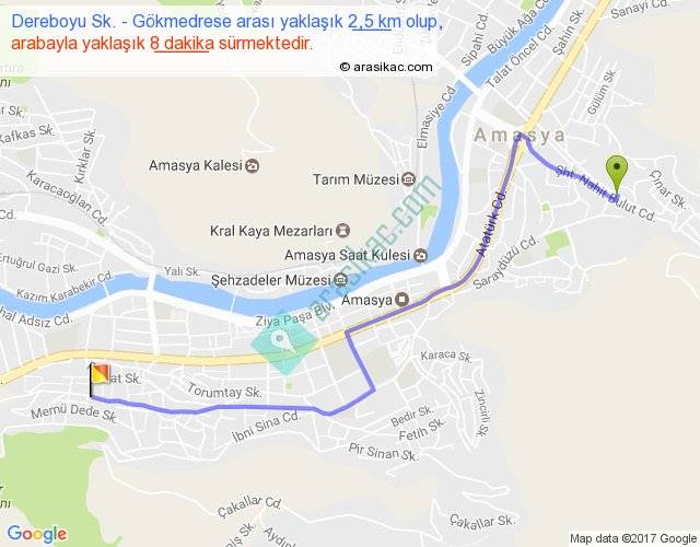 Dereboyu Sk. - Gökmedrese arası yaklaşık olarak 90 km/h ile yukarıda belirtilen sürede olup, iki yerin kuş uçuşu uzaklığı (mesafesi) 2'dir. Yolculuk otobüsle 10 dakika sürmektedir.