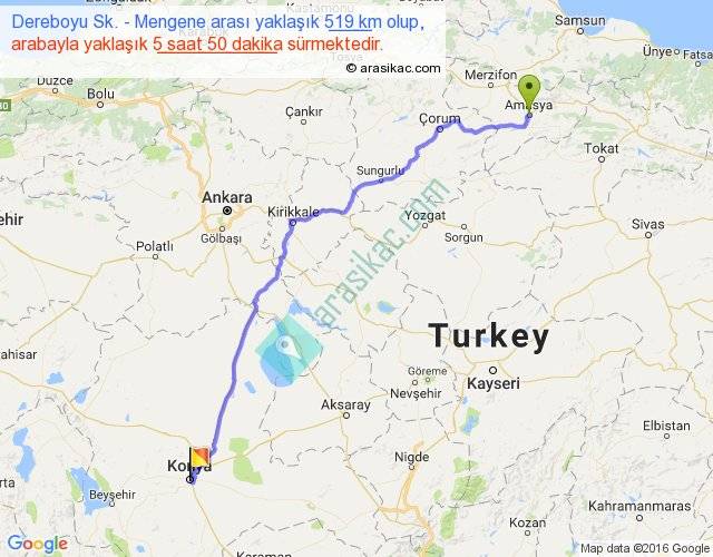 Dereboyu Sk. - Mengene arası yaklaşık olarak 90 km/h ile yukarıda belirtilen sürede olup, iki yerin kuş uçuşu uzaklığı (mesafesi) 421'dir. Eğer belirtilen yerler arasında uçak seferi var ise bu süre uçakla 38 dakika'ya kadar düşebilir. Yolculuk otobüsle 7 saat 35 dakika sürmektedir.