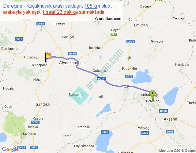 Dereçine - Küçükhüyük arası yaklaşık olarak 90 km/h ile yukarıda belirtilen sürede olup, iki yerin kuş uçuşu uzaklığı (mesafesi) 88'dir. Yolculuk otobüsle 1 saat 47 dakika sürmektedir.