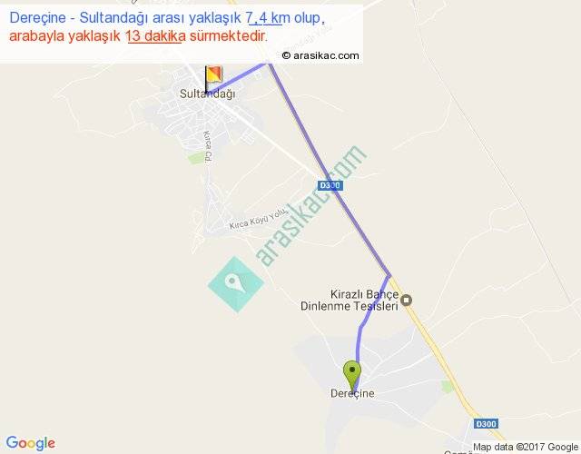 Dereçine - Sultandağı arası yaklaşık olarak 90 km/h ile yukarıda belirtilen sürede olup, iki yerin kuş uçuşu uzaklığı (mesafesi) 5'dir. Yolculuk otobüsle 16 dakika sürmektedir.