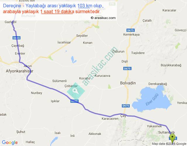 Dereçine - Yaylabağı arası yaklaşık olarak 90 km/h ile yukarıda belirtilen sürede olup, iki yerin kuş uçuşu uzaklığı (mesafesi) 82'dir. Yolculuk otobüsle 1 saat 42 dakika sürmektedir.