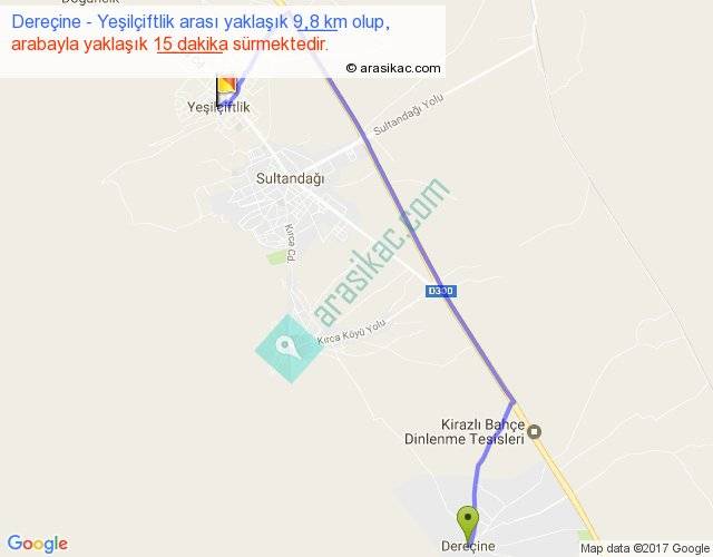 Dereçine - Yeşilçiftlik arası yaklaşık olarak 90 km/h ile yukarıda belirtilen sürede olup, iki yerin kuş uçuşu uzaklığı (mesafesi) 7'dir. Yolculuk otobüsle 19 dakika sürmektedir.