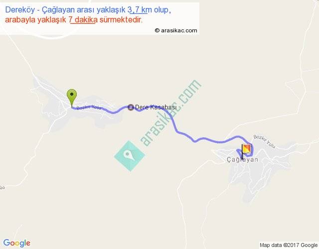 Dereköy - Çağlayan arası yaklaşık olarak 90 km/h ile yukarıda belirtilen sürede olup, iki yerin kuş uçuşu uzaklığı (mesafesi) 3'dir. Yolculuk otobüsle 9 dakika sürmektedir.