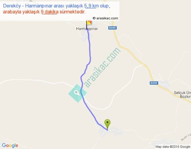 Dereköy - Harmanpınar arası yaklaşık olarak 90 km/h ile yukarıda belirtilen sürede olup, iki yerin kuş uçuşu uzaklığı (mesafesi) 5'dir. Yolculuk otobüsle 11 dakika sürmektedir.