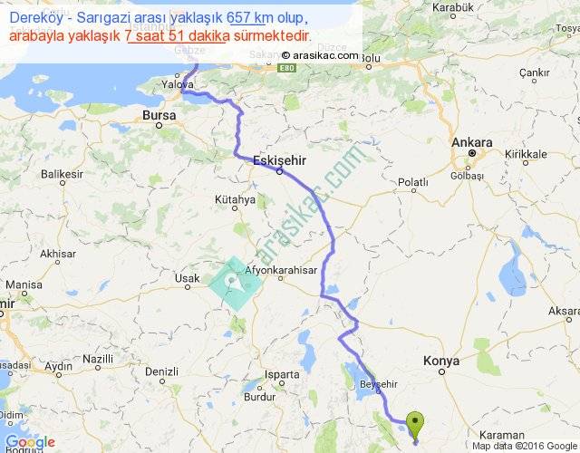 Eğer Dereköy Sarıgazi arası ne kadar yakar (benzin/mazot) diyorsanız, kilometrede 3 ₺ yakan bir aracınız var ise 1971, km'de 4 ₺ yakan bir aracınız var ise 2628, km'de 5 ₺ yakan bir aracınız var ise 3285 ile bu yolculuğu tamamlayabilirsiniz.