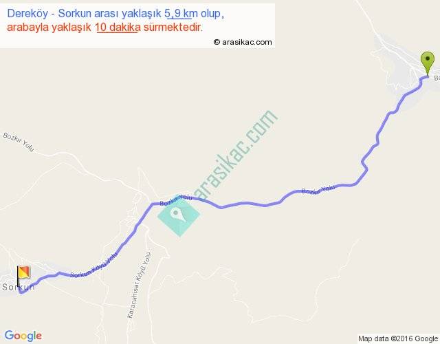 Dereköy - Sorkun arası yaklaşık olarak 90 km/h ile yukarıda belirtilen sürede olup, iki yerin kuş uçuşu uzaklığı (mesafesi) 5'dir. Yolculuk otobüsle 13 dakika sürmektedir.