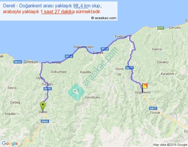 Dereli - Doğankent arası yaklaşık olarak 90 km/h ile yukarıda belirtilen sürede olup, iki yerin kuş uçuşu uzaklığı (mesafesi) 40'dir. Yolculuk otobüsle 1 saat 53 dakika sürmektedir.