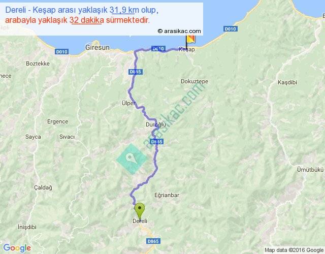 Dereli - Keşap arası yaklaşık olarak 90 km/h ile yukarıda belirtilen sürede olup, iki yerin kuş uçuşu uzaklığı (mesafesi) 20'dir. Yolculuk otobüsle 41 dakika sürmektedir.