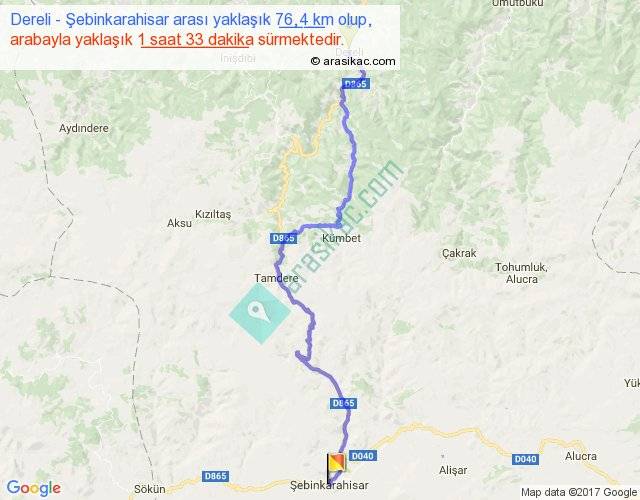 Dereli - Şebinkarahisar arası yaklaşık olarak 90 km/h ile yukarıda belirtilen sürede olup, iki yerin kuş uçuşu uzaklığı (mesafesi) 50'dir. Yolculuk otobüsle 2 saat 3 dakika sürmektedir.
