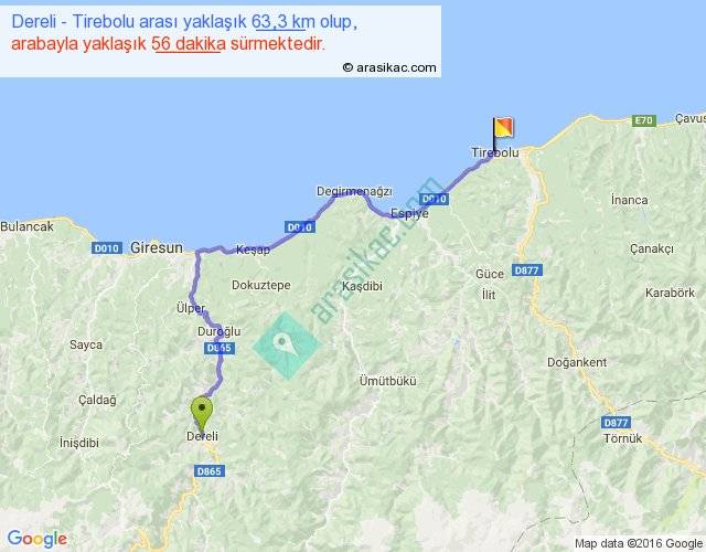 Dereli - Tirebolu arası yaklaşık olarak 90 km/h ile yukarıda belirtilen sürede olup, iki yerin kuş uçuşu uzaklığı (mesafesi) 43'dir. Yolculuk otobüsle 1 saat 12 dakika sürmektedir.