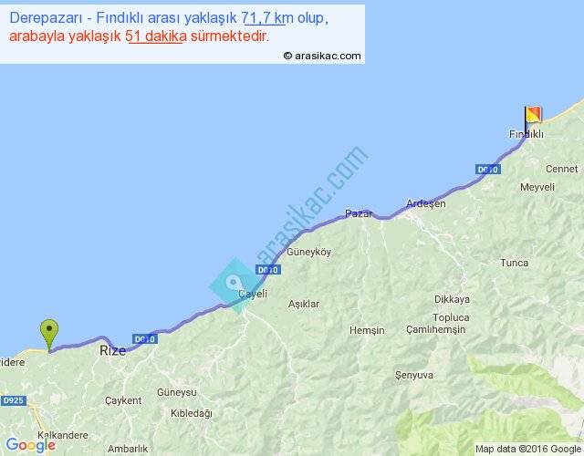 Derepazarı - Fındıklı arası yaklaşık olarak 90 km/h ile yukarıda belirtilen sürede olup, iki yerin kuş uçuşu uzaklığı (mesafesi) 66'dir. Yolculuk otobüsle 1 saat 6 dakika sürmektedir.