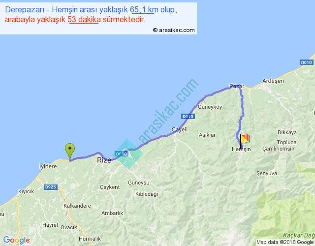 Derepazarı - Hemşin arası yaklaşık olarak 90 km/h ile yukarıda belirtilen sürede olup, iki yerin kuş uçuşu uzaklığı (mesafesi) 40'dir. Yolculuk otobüsle 1 saat 8 dakika sürmektedir.