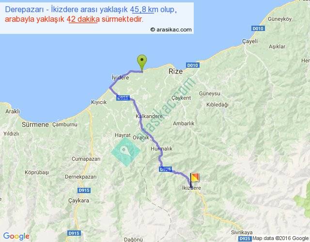 Derepazarı - İkizdere arası yaklaşık olarak 90 km/h ile yukarıda belirtilen sürede olup, iki yerin kuş uçuşu uzaklığı (mesafesi) 30'dir. Yolculuk otobüsle 54 dakika sürmektedir.