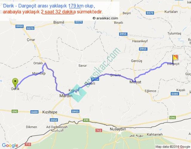 Derik - Dargeçit arası yaklaşık olarak 90 km/h ile yukarıda belirtilen sürede olup, iki yerin kuş uçuşu uzaklığı (mesafesi) 129'dir. Yolculuk otobüsle 3 saat 17 dakika sürmektedir.