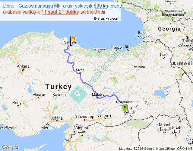 Derik - Gaziosmanpaşa Mh. arası yaklaşık olarak 90 km/h ile yukarıda belirtilen sürede olup, iki yerin kuş uçuşu uzaklığı (mesafesi) 545'dir. Eğer belirtilen yerler arasında uçak seferi var ise bu süre uçakla 50 dakika'ya kadar düşebilir. Yolculuk otobüsle 14 saat 45 dakika sürmektedir.