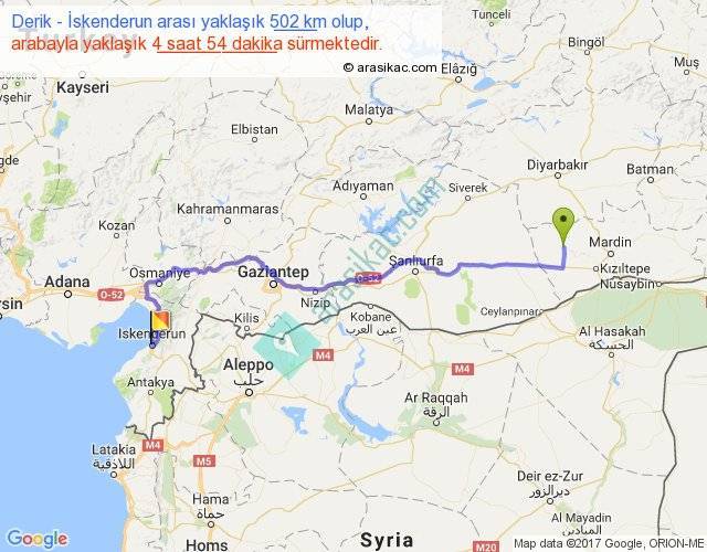 Derik - İskenderun arası yaklaşık olarak 90 km/h ile yukarıda belirtilen sürede olup, iki yerin kuş uçuşu uzaklığı (mesafesi) 372'dir. Eğer belirtilen yerler arasında uçak seferi var ise bu süre uçakla 34 dakika'ya kadar düşebilir. Yolculuk otobüsle 6 saat 22 dakika sürmektedir.