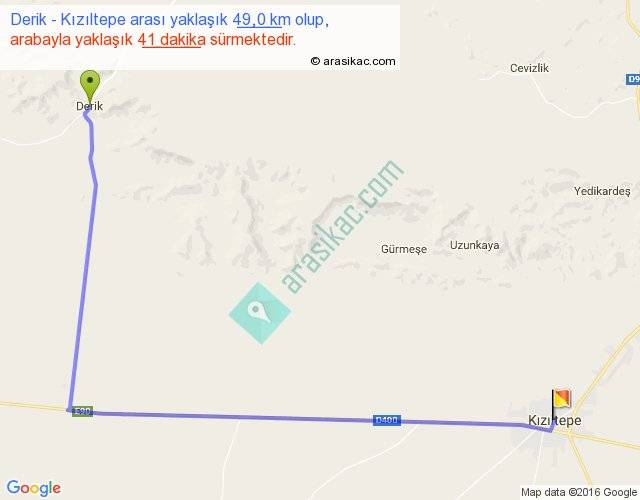 Derik - Kızıltepe arası yaklaşık olarak 90 km/h ile yukarıda belirtilen sürede olup, iki yerin kuş uçuşu uzaklığı (mesafesi) 34'dir. Yolculuk otobüsle 53 dakika sürmektedir.