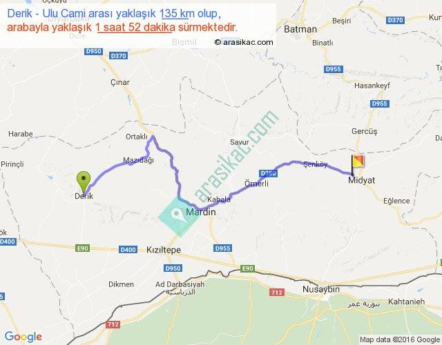 Derik - Ulu Cami arası yaklaşık olarak 90 km/h ile yukarıda belirtilen sürede olup, iki yerin kuş uçuşu uzaklığı (mesafesi) 94'dir. Yolculuk otobüsle 2 saat 25 dakika sürmektedir.