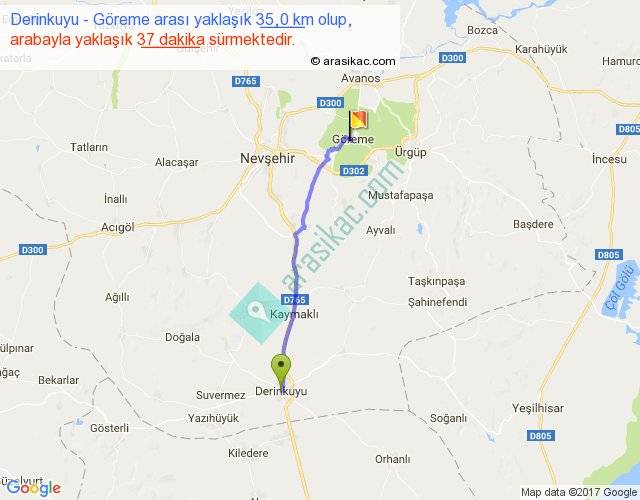 Derinkuyu - Göreme arası yaklaşık olarak 90 km/h ile yukarıda belirtilen sürede olup, iki yerin kuş uçuşu uzaklığı (mesafesi) 31'dir. Yolculuk otobüsle 48 dakika sürmektedir.