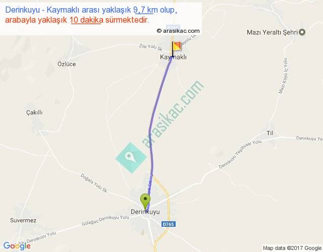 Derinkuyu - Kaymaklı arası yaklaşık olarak 90 km/h ile yukarıda belirtilen sürede olup, iki yerin kuş uçuşu uzaklığı (mesafesi) 9'dir. Yolculuk otobüsle 13 dakika sürmektedir.