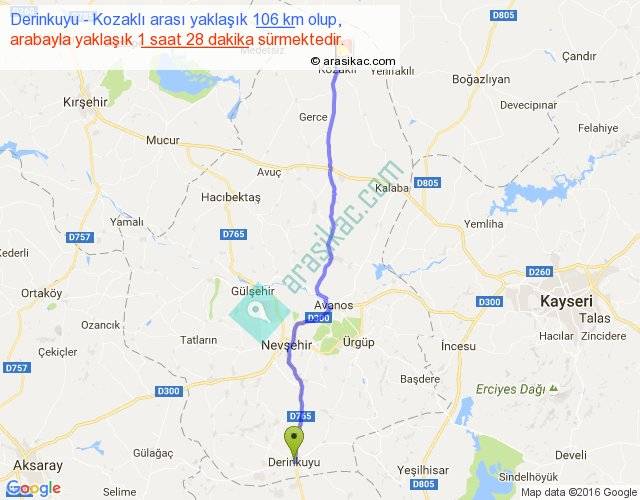 Derinkuyu - Kozaklı arası yaklaşık olarak 90 km/h ile yukarıda belirtilen sürede olup, iki yerin kuş uçuşu uzaklığı (mesafesi) 93'dir. Yolculuk otobüsle 1 saat 54 dakika sürmektedir.