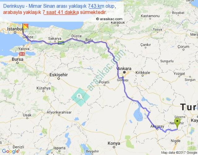 Eğer Derinkuyu Mimar Sinan arası ne kadar yakar (benzin/mazot) diyorsanız, kilometrede 3 ₺ yakan bir aracınız var ise 2229, km'de 4 ₺ yakan bir aracınız var ise 2972, km'de 5 ₺ yakan bir aracınız var ise 3715 ile bu yolculuğu tamamlayabilirsiniz.