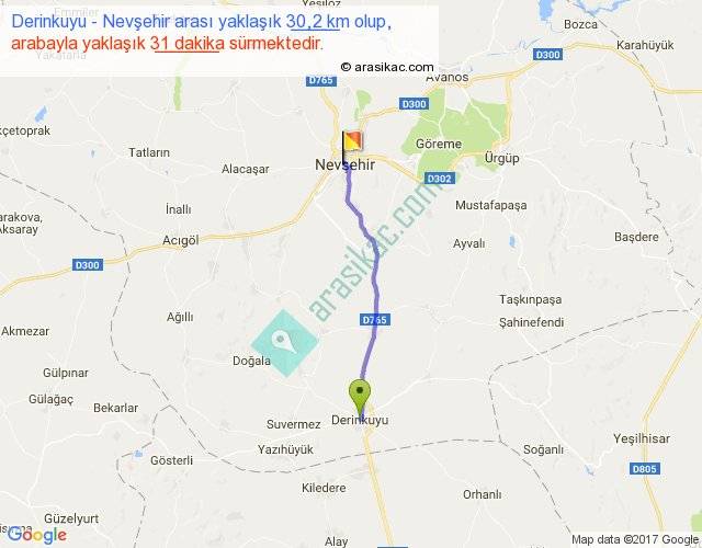 Derinkuyu - Nevşehir arası yaklaşık olarak 90 km/h ile yukarıda belirtilen sürede olup, iki yerin kuş uçuşu uzaklığı (mesafesi) 28'dir. Yolculuk otobüsle 39 dakika sürmektedir.