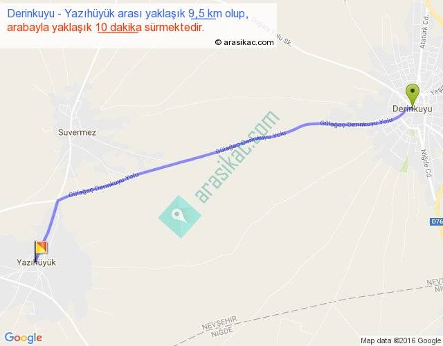Derinkuyu - Yazıhüyük arası yaklaşık olarak 90 km/h ile yukarıda belirtilen sürede olup, iki yerin kuş uçuşu uzaklığı (mesafesi) 9'dir. Yolculuk otobüsle 13 dakika sürmektedir.