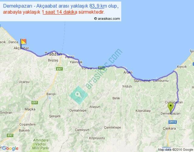 Dernekpazarı - Akçaabat arası yaklaşık olarak 90 km/h ile yukarıda belirtilen sürede olup, iki yerin kuş uçuşu uzaklığı (mesafesi) 62'dir. Yolculuk otobüsle 1 saat 36 dakika sürmektedir.