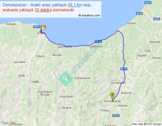 Dernekpazarı - Araklı arası yaklaşık olarak 90 km/h ile yukarıda belirtilen sürede olup, iki yerin kuş uçuşu uzaklığı (mesafesi) 22'dir. Yolculuk otobüsle 42 dakika sürmektedir.