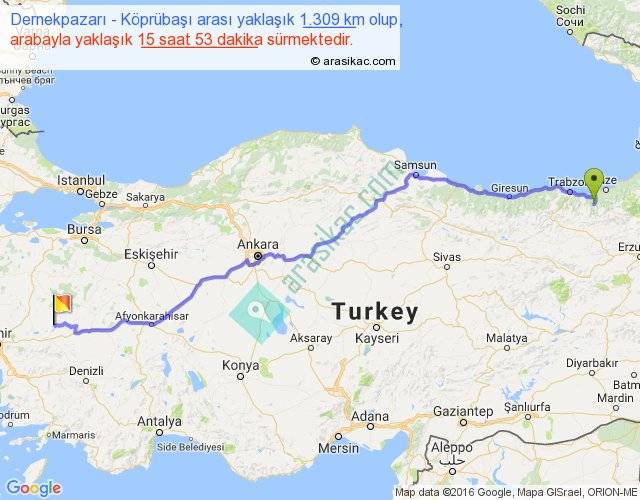 Dernekpazarı - Köprübaşı arası yaklaşık olarak 90 km/h ile yukarıda belirtilen sürede olup, iki yerin kuş uçuşu uzaklığı (mesafesi) 1031'dir. Eğer belirtilen yerler arasında uçak seferi var ise bu süre uçakla 1 saat 35 dakika'ya kadar düşebilir. Yolculuk otobüsle 20 saat 38 dakika sürmektedir.