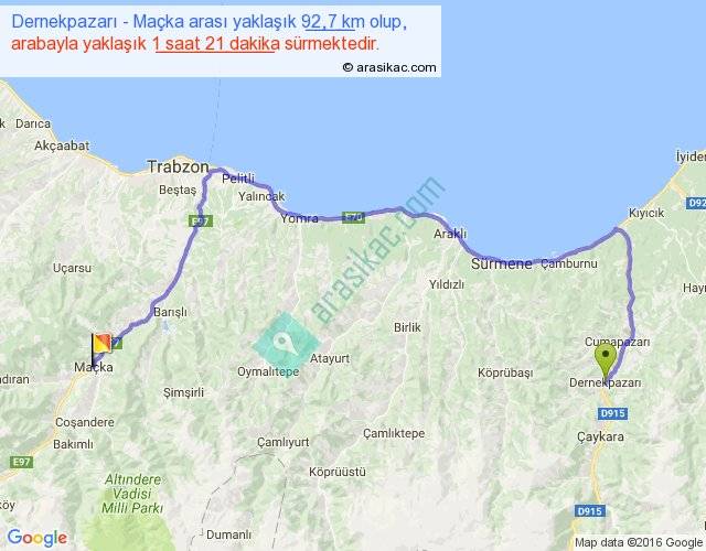 Dernekpazarı - Maçka arası yaklaşık olarak 90 km/h ile yukarıda belirtilen sürede olup, iki yerin kuş uçuşu uzaklığı (mesafesi) 53'dir. Yolculuk otobüsle 1 saat 45 dakika sürmektedir.