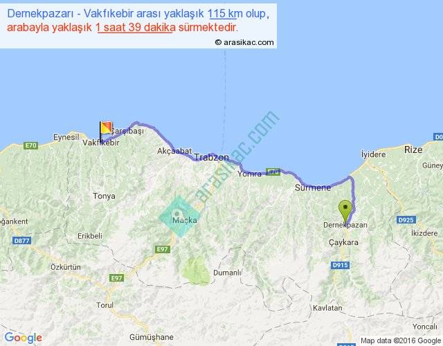 Dernekpazarı - Vakfıkebir arası yaklaşık olarak 90 km/h ile yukarıda belirtilen sürede olup, iki yerin kuş uçuşu uzaklığı (mesafesi) 85'dir. Yolculuk otobüsle 2 saat 8 dakika sürmektedir.