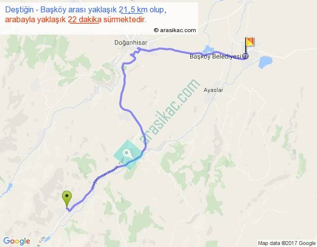 Deştiğin - Başköy arası yaklaşık olarak 90 km/h ile yukarıda belirtilen sürede olup, iki yerin kuş uçuşu uzaklığı (mesafesi) 14'dir. Yolculuk otobüsle 28 dakika sürmektedir.
