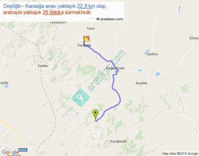 Deştiğin - Karaağa arası yaklaşık olarak 90 km/h ile yukarıda belirtilen sürede olup, iki yerin kuş uçuşu uzaklığı (mesafesi) 15'dir. Yolculuk otobüsle 33 dakika sürmektedir.