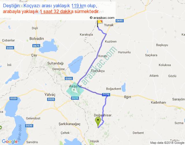 Deştiğin - Koçyazı arası yaklaşık olarak 90 km/h ile yukarıda belirtilen sürede olup, iki yerin kuş uçuşu uzaklığı (mesafesi) 82'dir. Yolculuk otobüsle 1 saat 59 dakika sürmektedir.