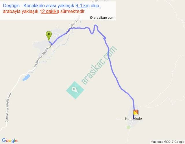 Deştiğin - Konakkale arası yaklaşık olarak 90 km/h ile yukarıda belirtilen sürede olup, iki yerin kuş uçuşu uzaklığı (mesafesi) 6'dir. Yolculuk otobüsle 15 dakika sürmektedir.