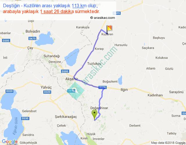 Deştiğin - Kuzören arası yaklaşık olarak 90 km/h ile yukarıda belirtilen sürede olup, iki yerin kuş uçuşu uzaklığı (mesafesi) 71'dir. Yolculuk otobüsle 1 saat 51 dakika sürmektedir.