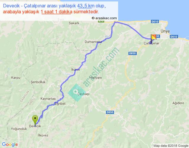 Devecik - Çatalpınar arası yaklaşık olarak 90 km/h ile yukarıda belirtilen sürede olup, iki yerin kuş uçuşu uzaklığı (mesafesi) 28'dir. Yolculuk otobüsle 1 saat 19 dakika sürmektedir.