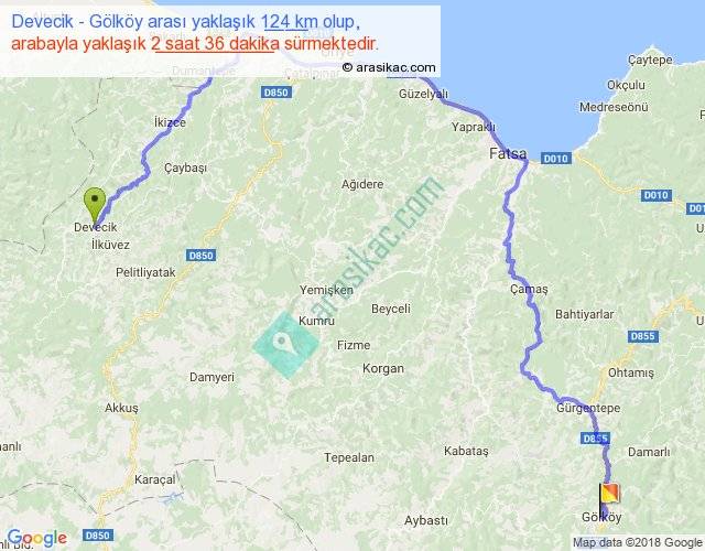 Devecik - Gölköy arası yaklaşık olarak 90 km/h ile yukarıda belirtilen sürede olup, iki yerin kuş uçuşu uzaklığı (mesafesi) 61'dir. Yolculuk otobüsle 3 saat 22 dakika sürmektedir.