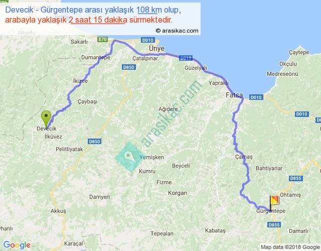 Devecik - Gürgentepe arası yaklaşık olarak 90 km/h ile yukarıda belirtilen sürede olup, iki yerin kuş uçuşu uzaklığı (mesafesi) 55'dir. Yolculuk otobüsle 2 saat 55 dakika sürmektedir.