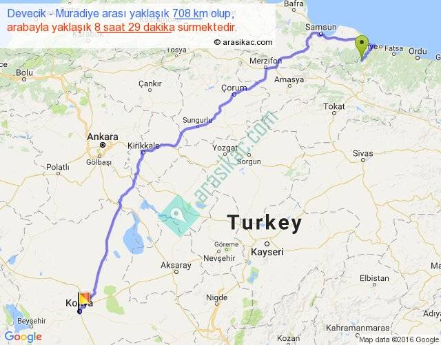 Devecik - Muradiye arası yaklaşık olarak 90 km/h ile yukarıda belirtilen sürede olup, iki yerin kuş uçuşu uzaklığı (mesafesi) 515'dir. Eğer belirtilen yerler arasında uçak seferi var ise bu süre uçakla 47 dakika'ya kadar düşebilir. Yolculuk otobüsle 11 saat 1 dakika sürmektedir.