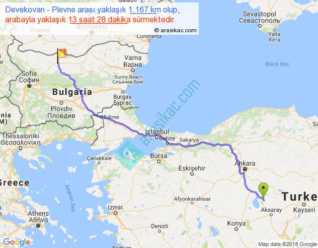 Devekovan - Plevne arası yaklaşık olarak 90 km/h ile yukarıda belirtilen sürede olup, iki yerin kuş uçuşu uzaklığı (mesafesi) 908'dir. Eğer belirtilen yerler arasında uçak seferi var ise bu süre uçakla 1 saat 23 dakika'ya kadar düşebilir. Yolculuk otobüsle 17 saat 30 dakika sürmektedir.