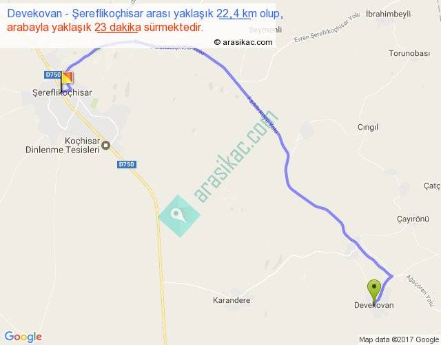 Devekovan - Şereflikoçhisar arası yaklaşık olarak 90 km/h ile yukarıda belirtilen sürede olup, iki yerin kuş uçuşu uzaklığı (mesafesi) 16'dir. Yolculuk otobüsle 29 dakika sürmektedir.