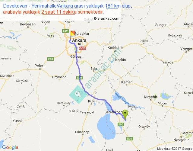 Devekovan - Yenimahalle Ankara arası yaklaşık olarak 90 km/h ile yukarıda belirtilen sürede olup, iki yerin kuş uçuşu uzaklığı (mesafesi) 152'dir. Yolculuk otobüsle 2 saat 50 dakika sürmektedir.